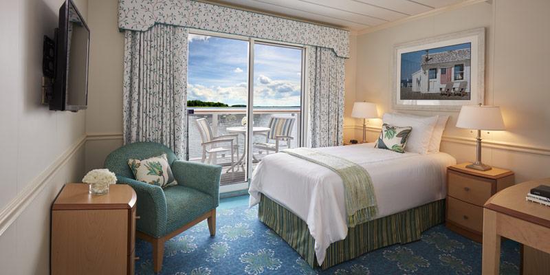 SB1 staterooms on the main deck offer complete comfort with approximately 275 sq. ft. of living space. Enjoy a full-size bathroom, large picture window, and door leading out to a furnished private balcony. These staterooms also feature a large sitting area, ideal for getting together with friends.